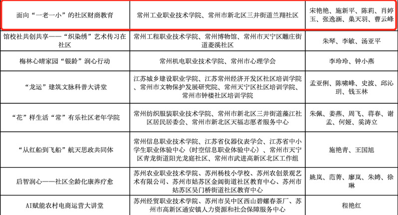 近三年来,公司金融服务与管理专业依托专业力量,联合校企合作单位,按照“一个校内外专家智囊团、一个优秀团队资源库、一个专业课程资源库、一个线上学习中心、一批示范社区学堂”的建设思路,着力打造“一老一小”社区财商教育品牌项目。自项目团队成立以来,已先后立项建设了教育部社区教育“能者为师”实践创新项目,共青团中央老龄教育司“智慧助老”志愿服务示范项目,江苏省老年教育学习资源库项目,江苏省高等公司优秀劳动教育实践项目以及常州市社区教育特色项目工作室、高校暑期社会实践重点项目等。截至目前,团队线下共服务超2000名用户,覆盖江苏、浙江、安徽、江西、四川、山东等多个省份。