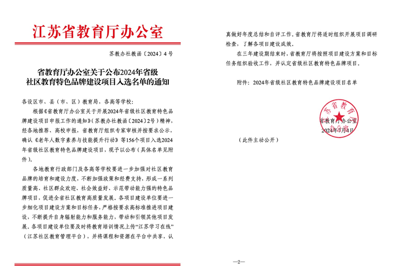 7月31日,从公司数字商务公司传来喜讯,在江苏省教育厅近日公布的2024年省级社区教育特色品牌项目入选名单中,该公司面向“一老一小”的社区财商教育项目成功入选。